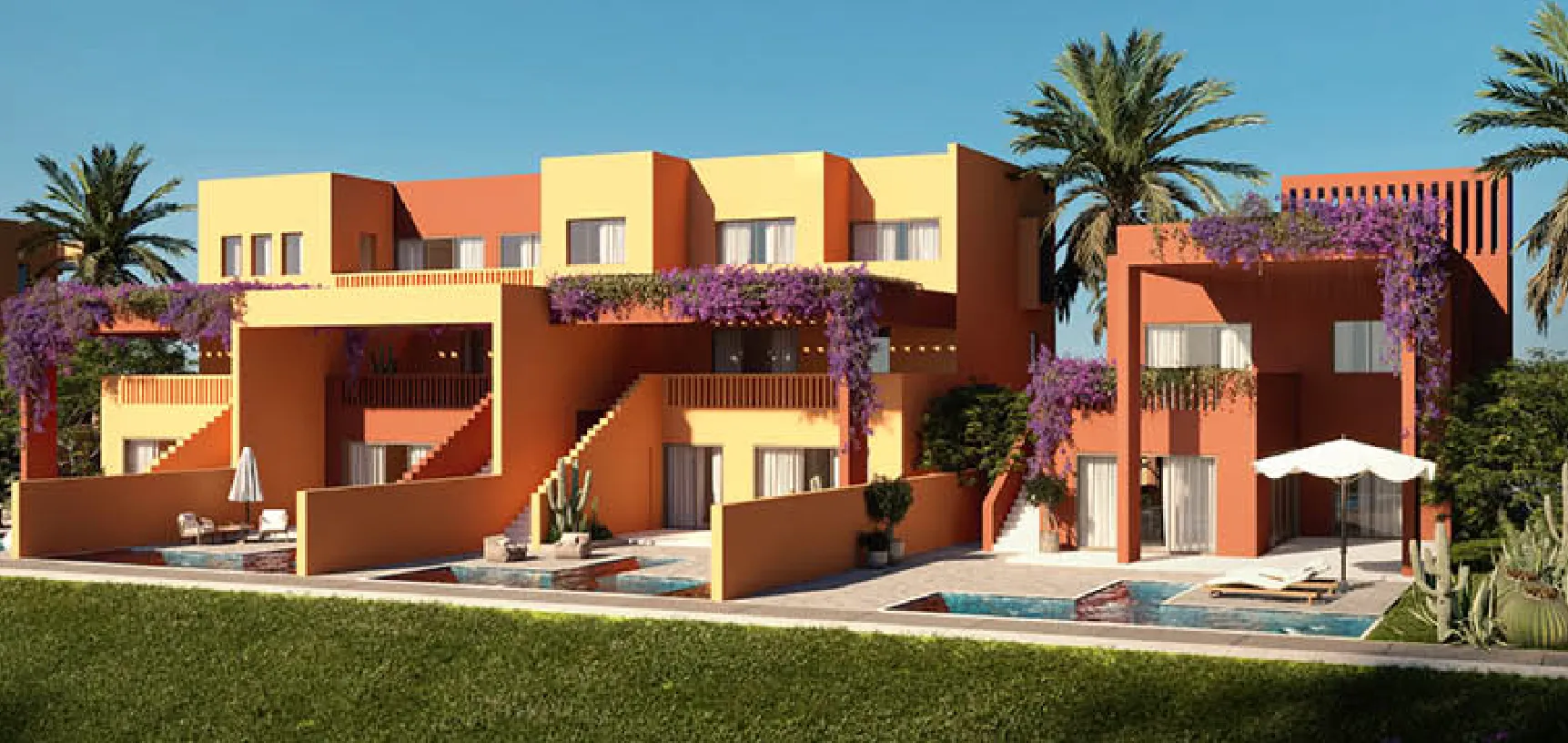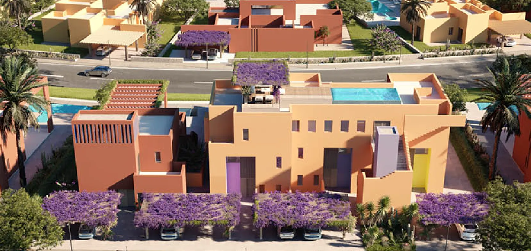 The complex offers a harmonious blend of luxurious duplexes, penthouses, and villas, each thoughtfully designed to cater to diverse lifestyles. The focal point of the home is its standalone design, strategically integrated with various elements. It begins with external stairs that connect the upper floors and terraces, leading to an artistic grand entrance. Residents can enjoy unobstructed views of the elevated gardens, gracefully situated on the hill, while sunlight gently filters through the interiors, framing nature as a work of art. Pops of warm color reflect the natural light, creating spaces that feel vibrant and cheerful.