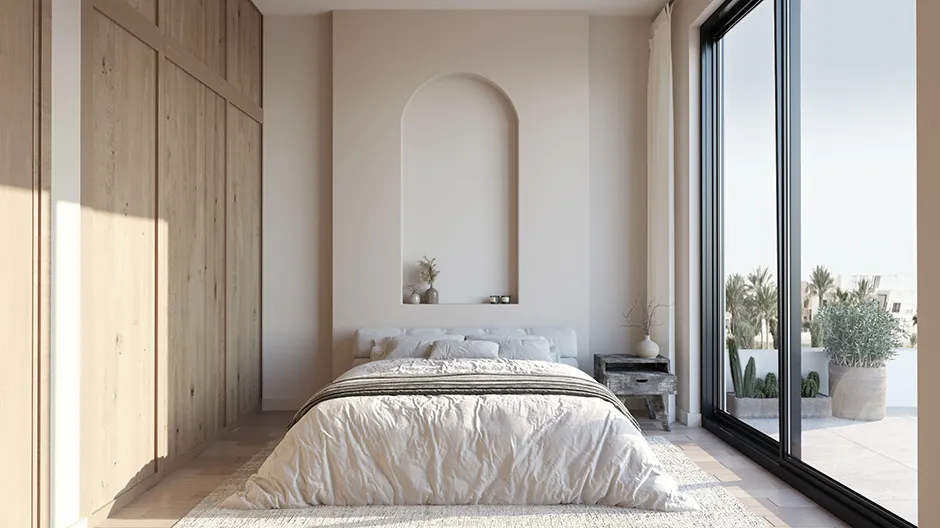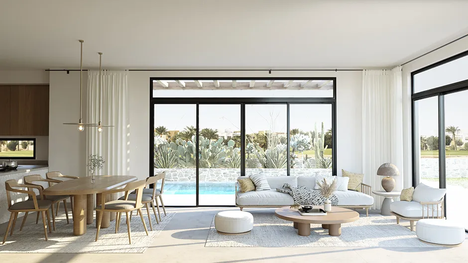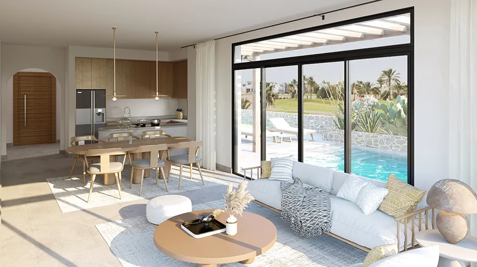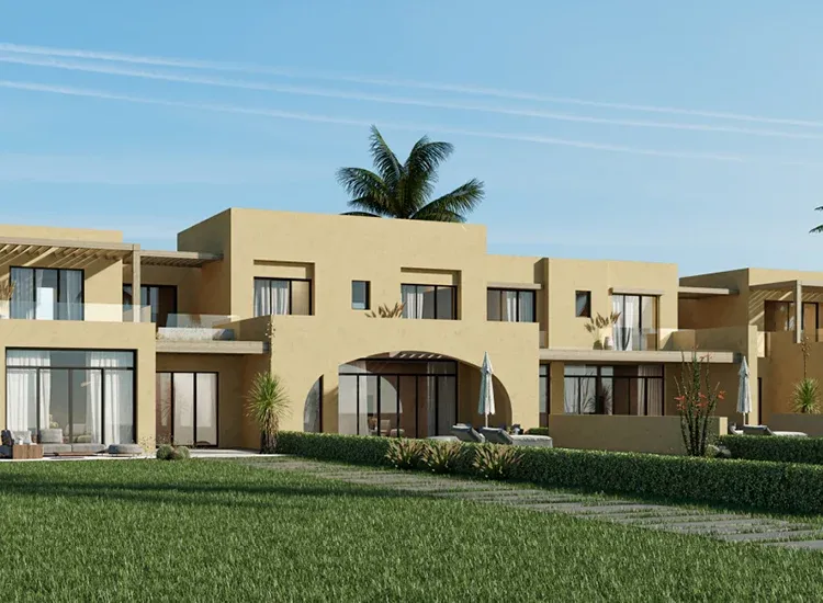 This 145m² oasis, set against the lush green backdrop of El Gouna's Ancient Sands Golf Course, offers serenity. The two-story, three-bedroom residence embodies authentic design with natural light filtering through the windows. The property also boasts a rooftop terrace, a nearby laundry area, and a nanny’s room with a bathroom. Upon request, a swimming pool can be incorporated for added luxury.